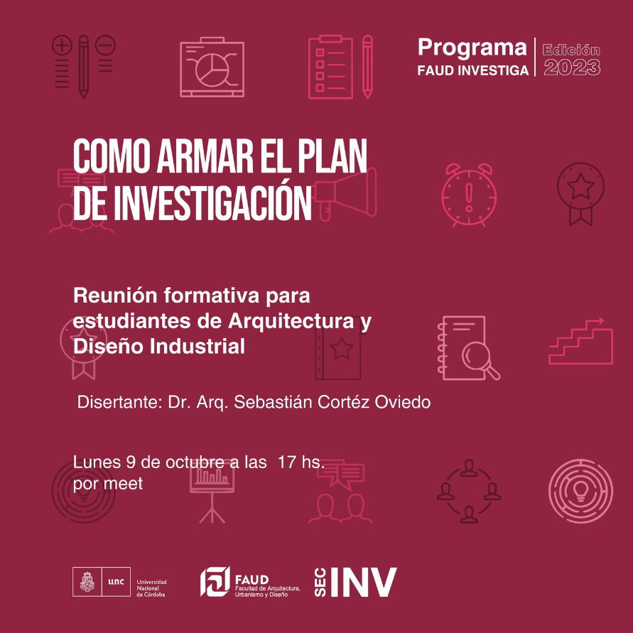 El lunes 9 de octubre tuvo lugar la charla formativa en investigación, en el marco de una nueva convocatoria a Becas del programa FAUD Investiga Edición 2023. El evento estuvo organizado por la Secretaría de Investigación de la FAUD-UNC y tuvo como público objetivo tanto a estudiantes avanzados como a directores de proyectos. El propósito principal fue explorar y debatir enfoques y métodos relacionados con la investigación orientada al diseño, así como abordar cuestiones instrumentales fundamentales en la elaboración de un plan de trabajo. La charla estuvo a cargo del Dr. Sebastián Cortez Oviedo.